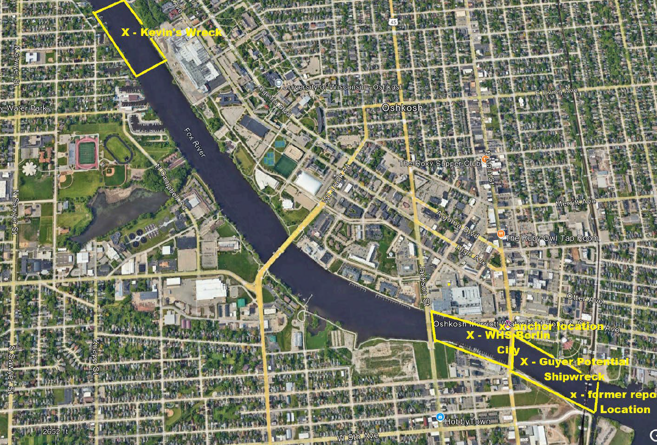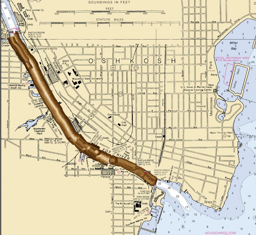 In 2017, Jerry Guyer was contracted to survey the lower section of the Fox River between the Hwy 45 bridge and the Oshkosh Train Bridge at the mouth of the Fox. This survey was done due to construction work related to the Train Bridge. (See Fig 1.)