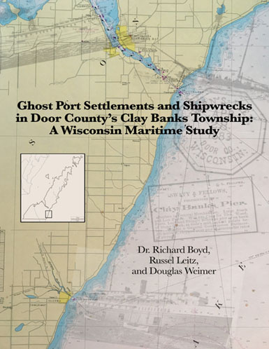 Wisconsin’s Door County Peninsula harbors over a dozen ghost town sites. Many of these vanished communities were actually small lake ports, associated with the logging industry and related pioneer enterprises that blossomed shortly after the Civil War. The Lake Michigan coastline of Clay Banks, the smallest township in Door County, had four such “ghost port” settlements. Maritime shipping was essential for these hamlets because roads and railways were lacking or ineffective. However, the waters off this township are fringed by numerous rocky shoals, which necessitated the construction of extensive piers to ship the products generated by logging, farming and fishing enterprises. A key interdependency evolved between these sawmill-communities and nautical commerce from their mega-piers. Despite these lengthy docks, many shipwrecks and maritime mishaps occurred on the dangerous reefs, as well as at the piers themselves. As the logging era faded, the sawmills closed, local businesses dwindled away, and the massive docks crumbled into the lake, until each settlement had virtually disappeared, leaving only underwater or underground remnants to tell their stories.